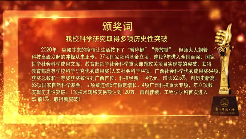 人文强桂主力军,实现突破创新高:教育部哲学社会科学重大课题攻关项目和国家哲学社会科学成果文库实现零的突破;37项国家社科基金、4项高等学校科学研究优秀成果奖(人文社会科学)、6项广西社科优秀成果一等奖、64项广西社科优秀成果奖,数量均位列广西首位,开创我校历史新高!科技兴桂生力军,矢志不移谋创新。科技经费1.14亿元,增长52.5%,创历史新高;53项国家自然科学基金,立项数连续5年稳定增长。4项广西科技重大专项,年立项数实现历史性突破。1项技术转移交易额达到120万,再创佳绩。工程学学科首次进入ESI前1%,取得新突破!