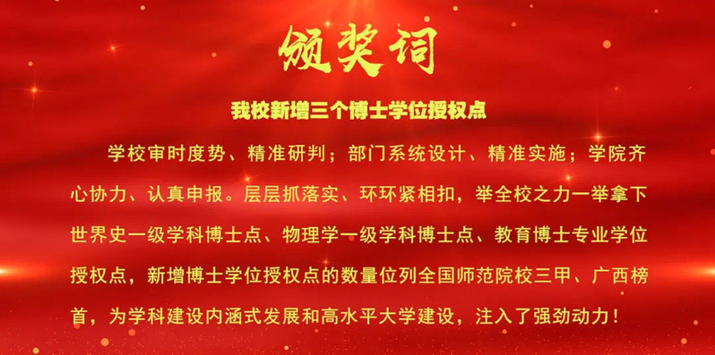 学校审时度势、精准研判;部门系统设计、精准实施;学院齐心协力、认真申报。层层抓落实、环环紧相扣,举全校之力一举拿下世界史一级学科博士点、物理学一级学科博士点、教育博士专业学位授权点,新增博士学位授权点的数量位列全国师范院校三甲、广西榜首,为学科建设内涵式发展和高水平大学建设,注入了强劲动力!