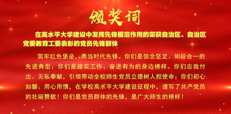 搭桥开路看先锋,干秋基业需党员。在大力推进党员教育工作和先锋榜样的树立打造过程中,我校取得了一系列丰硕成果,在2021年自治区、自治区党委教育工委“两优一先”的表彰中,我校1名党员荣获自治区优秀共产党员、14名党员荣获自治区党委教育工委优秀共产党员、7名党员荣获自治区党委教育工委优秀党务工作者等荣誉。