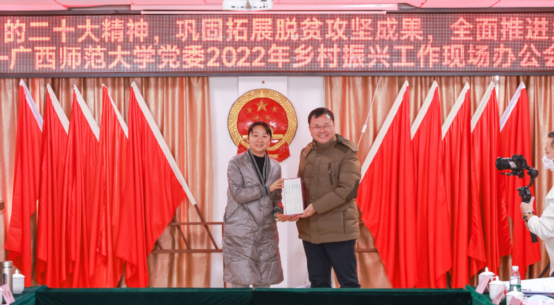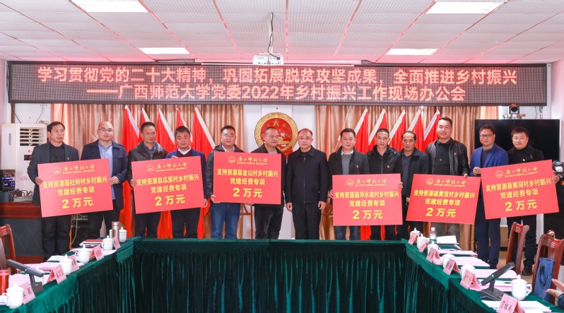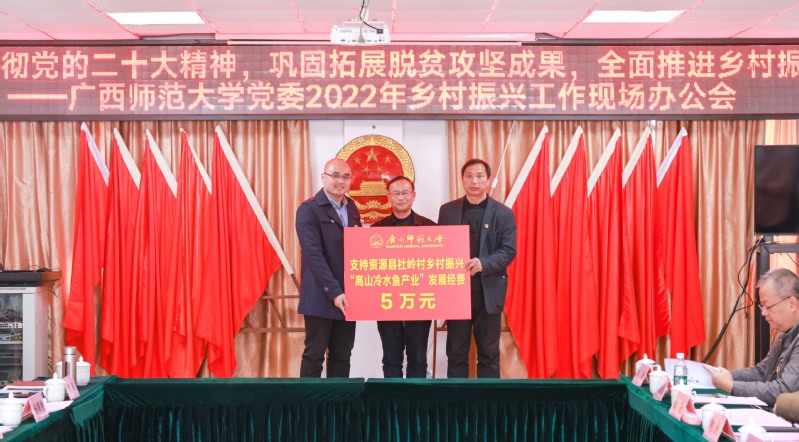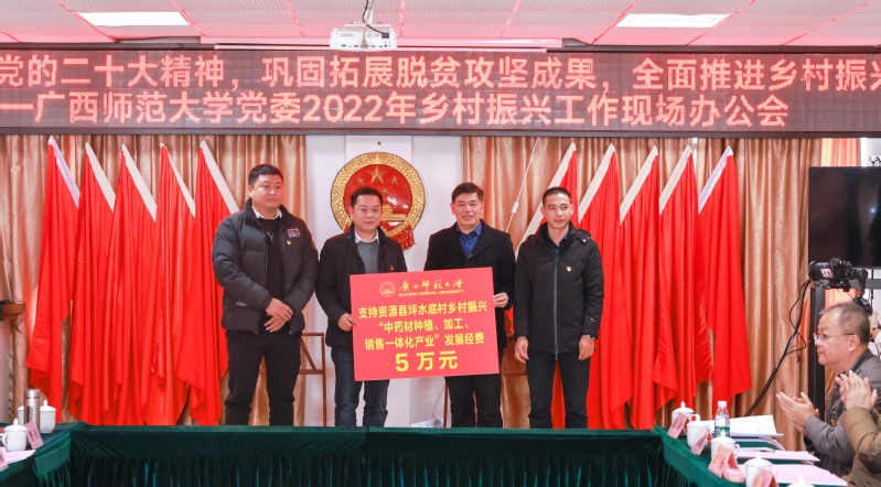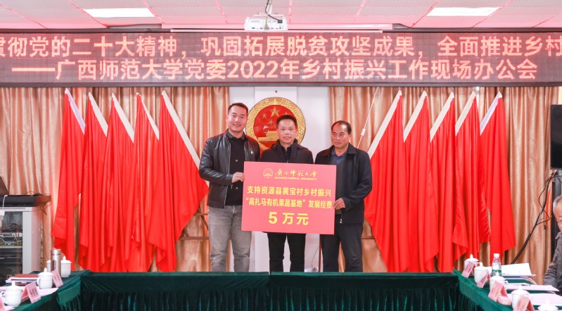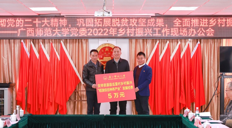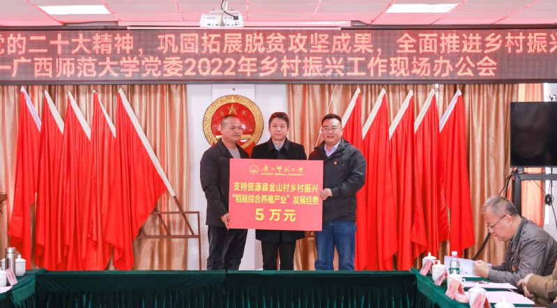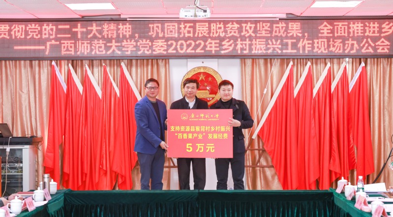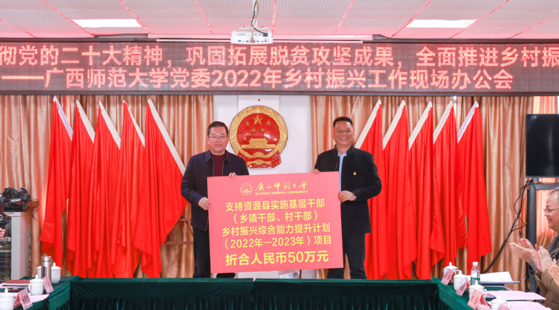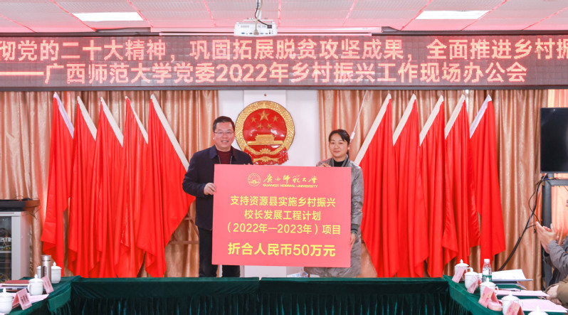 现场办公会结束后,学校举行了广西师范大学支持资源县对口帮扶村乡村振兴资金颁发仪式。在资源县基层干部(乡镇干部、村干部)乡村振兴综合能力提升计划(2022年—2023年)项目启动仪式上,学校决定支持项目经费50万元;在资源县实施乡村振兴校长发展工程计划(2022年—2023年)项目启动仪式上,学校决定支持项目经费50万元。