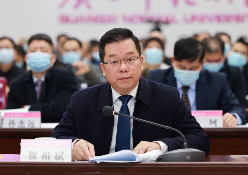 贺祖斌校长在会上对出席会议的各位领导、专家表示感谢。他介绍了学校90年来在本科教育教学方面的整体办学成绩,从秉承“弘文励教”传统,以“五聚焦”着力培养具有创新精神和创新能力的时代新人;依托学科优势,以“科教融合”支撑学术型人才培养特色不断彰显;强基础求卓越,以“专创融合”为主导,探索大学生创新能力培养新模式等三个方面,总结了学校学术型人才培养的特色亮点。他强调,本次新一轮本科教育教学审核评估试点对推进学校高质量建设与发展具有重要的意义,是学校加快建设国际知名、教师教育特色鲜明的国内一流大学的一次重要契机,也是找差距、补短板、强优势、创特色的一次难得的机会。他表示,全校上下将按照新一轮审核评估的要求和程序,全力以赴做好各项评建工作,以试点成效全面展示办学水平和育人质量,以评估理念引领改革、以评估举措深化改革,为落实立德树人根本任务,为广西高等教育高质量发展作出新的更大贡献。