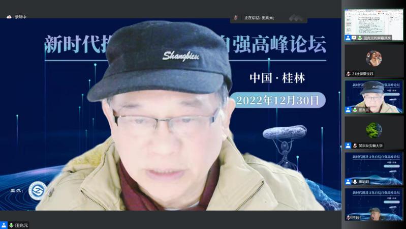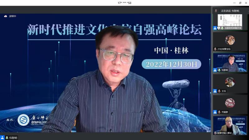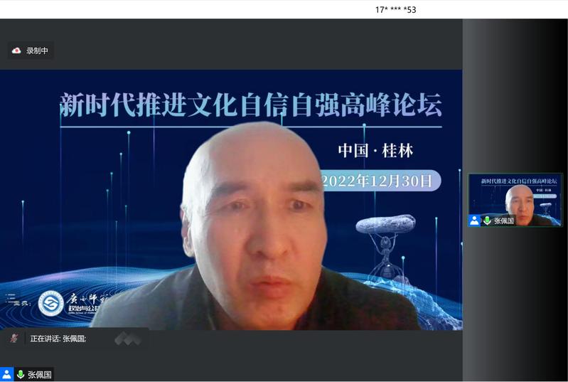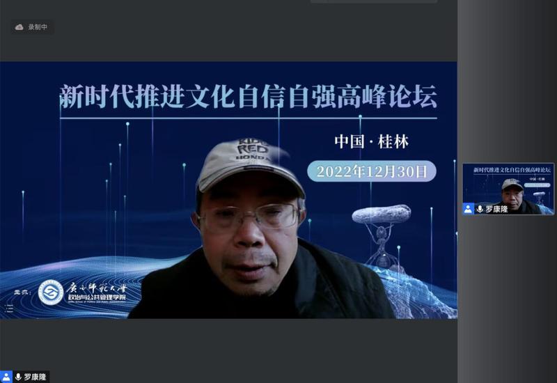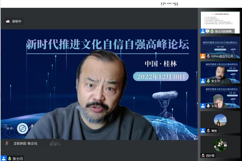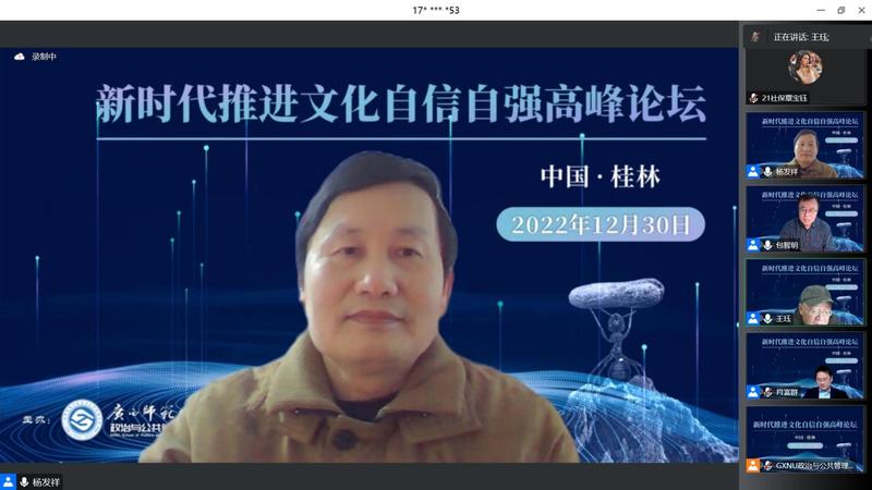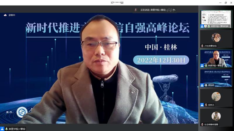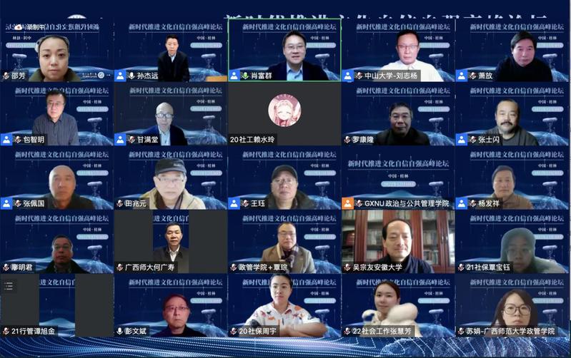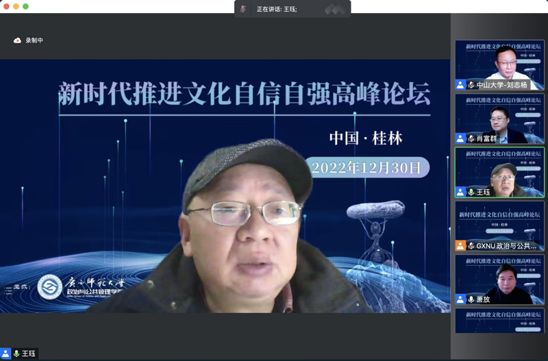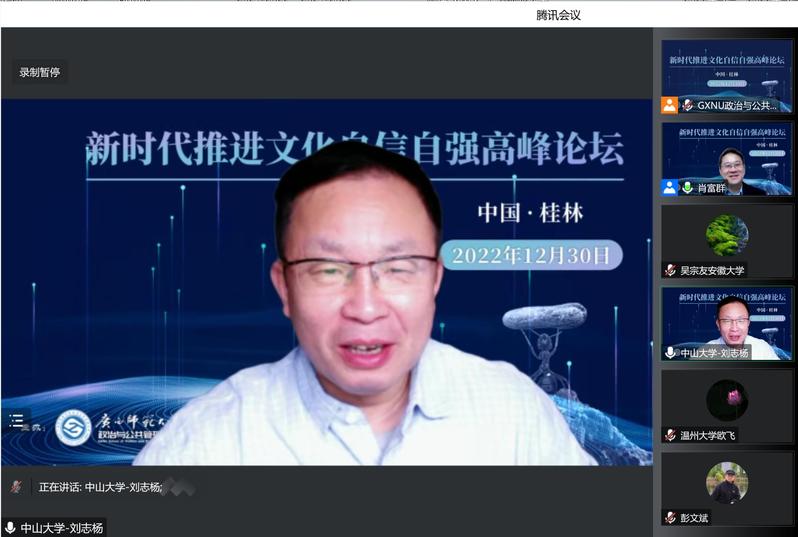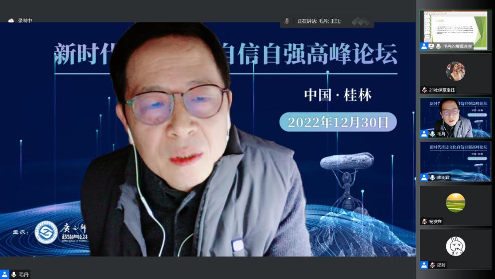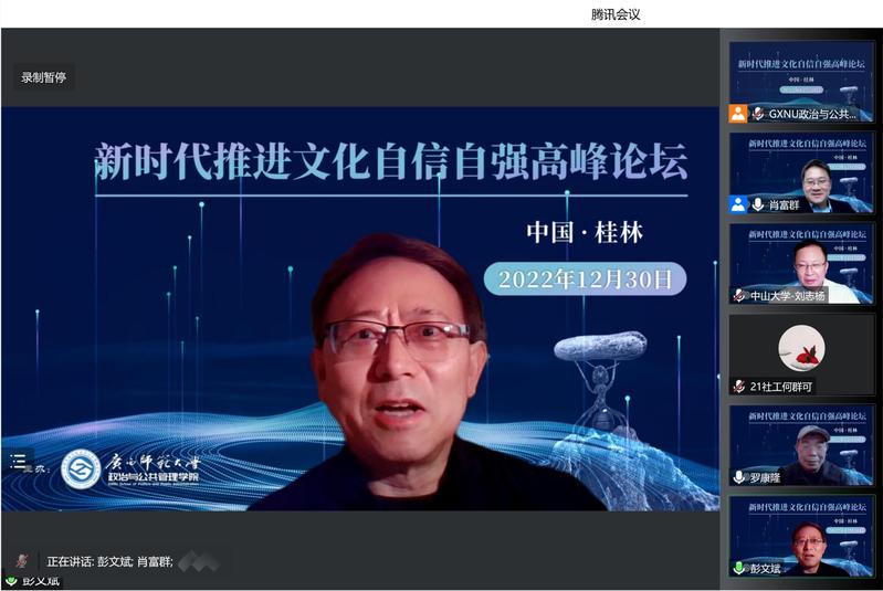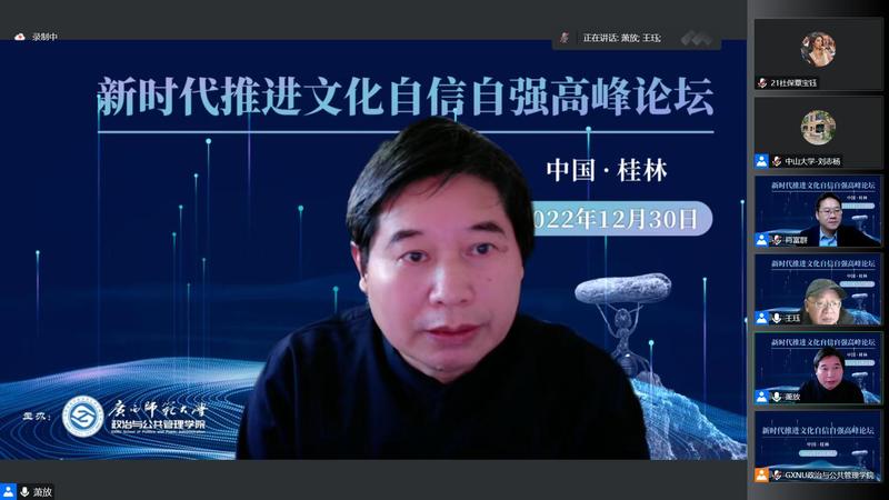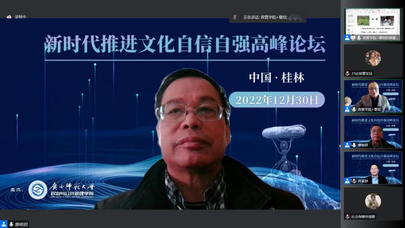 为全面学习贯彻党的二十大报告中提出的“推进文化自信自强,铸就社会主义文化新辉煌”的精神和要求,在广西师范大学建校九十周年(1932-2022)、广西师范大学政治与公共管理学院成立二十周年(2002-2022)之际,2022年12月30日,新时代推进文化自信自强高峰论坛在广西师范大学线上成功举办。此次高峰论坛由⼴西师范⼤学政治与公共管理学院主办,我校党委常委、副校长孙杰远教授、中山大学刘志扬教授、北京师范大学萧放教授、山东大学张士闪教授、上海交通大学张佩国教授、福州大学甘满堂教授、华东理工大学杨发祥教授、贵州民族大学包智明教授、西南民族大学王珏教授、吉首大学罗康隆教授、四川师范大学彭文斌教授、浙江大学毛丹教授、安徽大学吴宗友教授、华东师范大学田兆元教授、广西民族大学廖明君教授、我校覃琮教授和来自全国各高校的500多位师生齐聚云端,研讨交流新时代文化自信自强的道路建设与发展问题。政治与公共管理学院行政负责人主持论坛。