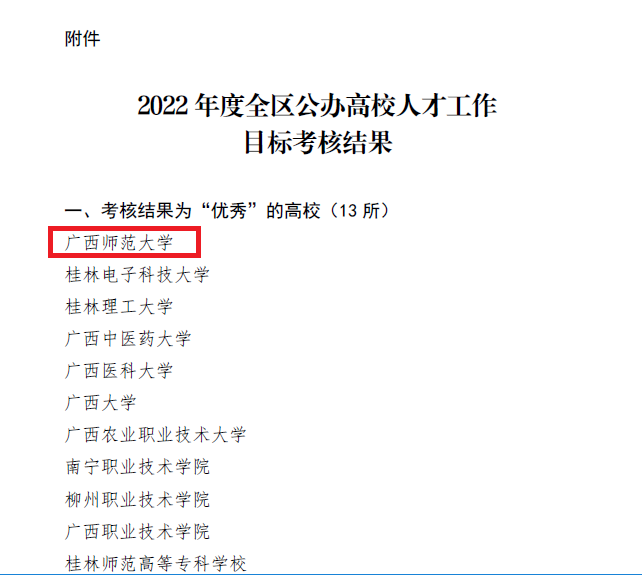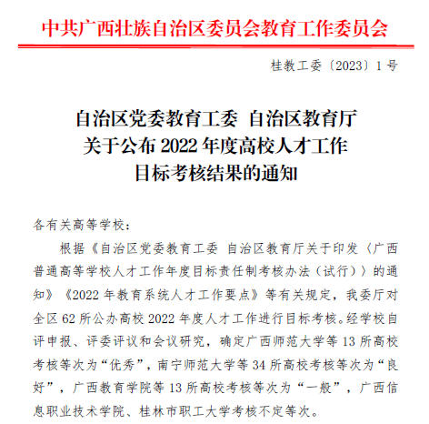 根据自治区党委教育工委、自治区教育厅《关于公布2022年度高校人才工作目标考核结果的通知》,我校在2022年度广西高校人才工作目标考核中荣获“优秀”等级。这是自治区教育厅从2020年度启动实施该项考核工作后,我校连续三年考评结果均获“优秀”等级。