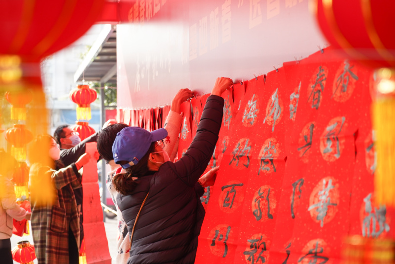 火红灯笼高高挂,副副对联添锦绣。气氛热烈、翰墨飘香的活动现场,吸引了不少师生的关注和参与,领取台前人头攒动,“春临大地百花艳,节至人间万象新”“春光一地映祥光,和气盈门迎福气”等喜庆的话语充满了浓浓的年味。一副副寓意深远的春联,一枚枚福气满满的福字,一个个喜庆精美的灯笼,新年红、中国红,照亮师大人喜庆洋洋的红脸蛋,千万道炫目的红此刻在师大校园汇聚,处处洋溢着喜庆的节日氛围,共贺火热中国年。