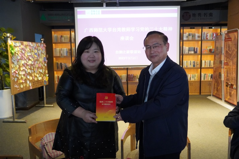 座谈会上,黄海波代表台胞之家联谊站向我校中国台湾教师赠送了《党的二十大报告学习辅导百问》。黄海波在领学党的二十大精神时强调,中国共产党第二十次全国代表大会,是在全党全国各族人民迈上全面建设社会主义现代化国家新征程、向第二个百年奋斗目标进军关键时刻召开的一次十分重要的大会。希望我校中国台湾教师认真学习领会党的二十大精神,积极参与到推进祖国和平统一、实现中华民族伟大复兴的光辉事业中来,努力成为促进祖国统一大业的坚定维护者。
