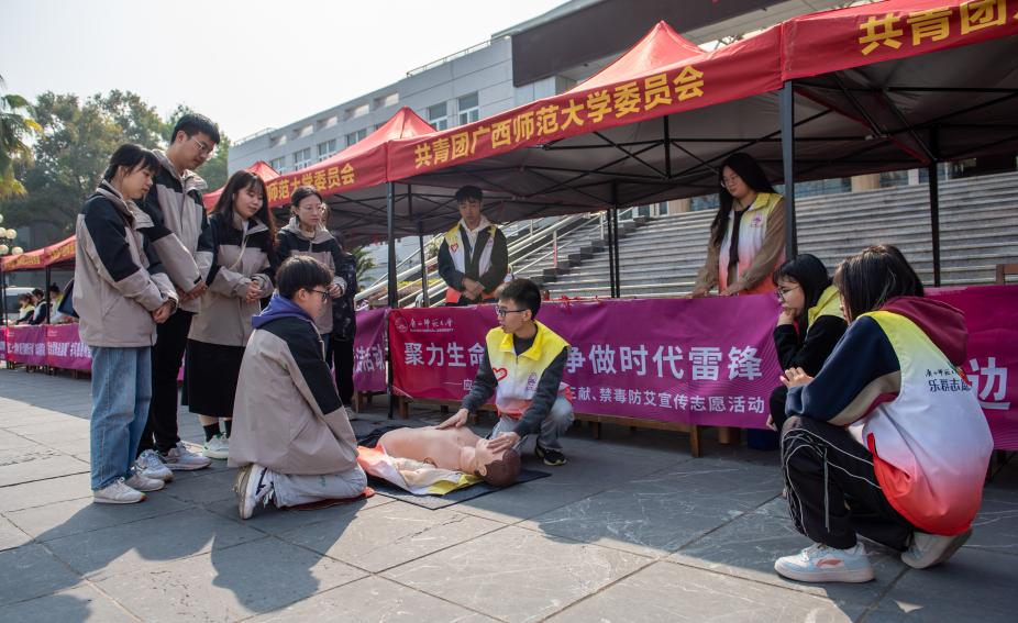 启动仪式后,学校部分志愿服务组织在育才及雁山两校区举行应急救护知识科普、闲置图书募捐等集中性示范活动,活动现场气氛热烈,活动吸引许多师生驻足参与。