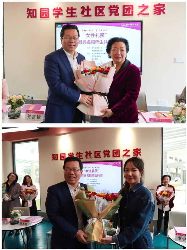 正值三八妇女节,学校在雁山校区知园学生社区举行“女性礼赞”经典名篇师生共读活动。校长贺祖斌出席并发表讲话。校女性发展研究所女教师代表,校长办公室、学生工作部(处)主要负责人,文学院/新闻与传播学院、经济管理学院、设计学院等学院师生代表近70人参加活动。
