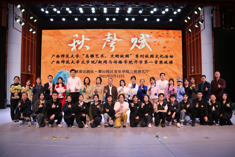 当晚,文学院/新闻与传播学院望道话剧社在雁山校区音乐学院三楼演艺厅展演了以“传承红色话剧经典,汇聚奋进青春力量”为主题的抗战题材话剧《秋声赋》。校党委宣传部、文学院/新闻与传播学院相关负责人以及师生代表共同观看了本次演出。
