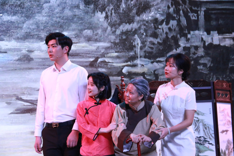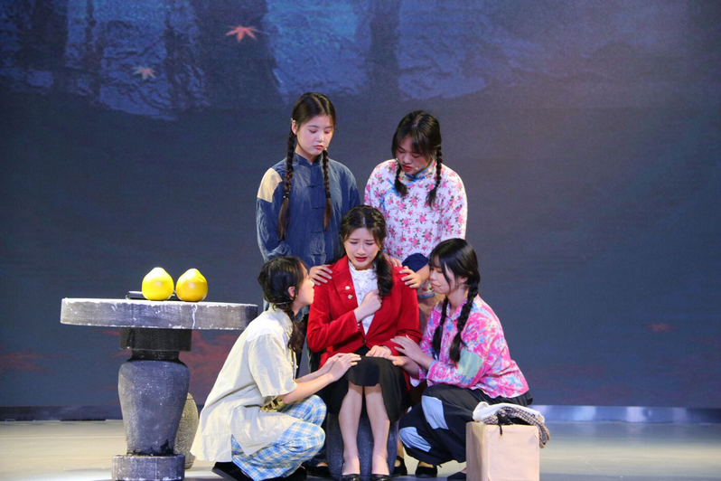 话剧《秋声赋》是著名戏剧家田汉于1941年在桂林创作排演的抗战题材话剧,其以家庭和恋爱生活为写照,讲述了一群知识分子因战乱而迁徙,同现实困境顽强斗争,最后毅然投身于抗战中的故事。话剧在秦淑瑾和旧友黄志强的谈话中拉开序幕,而此时恋人胡蓼红的突然到访,也使作家徐子羽原本苦闷的生活变得更加矛盾重重。随着胡蓼红到七星岩避难,话剧进入高潮。在这里,胡蓼红遇见了她曾在长沙帮助过的几个难童,一声声“妈妈万岁”的童声吹散了胡蓼红的伤悲与困惑,唤醒了她那颗关怀大众的心。在胡蓼红的劝说下,秦淑瑾也找回了自我,并同她前往战争一线。话剧在徐子羽和其女大纯的谈话中进入尾声。参演的学子们用情感饱满、细节得当、极富艺术表现力的生动演绎,歌颂着抗战时期一代知识分子坚定的革命信念与深厚的爱国情怀,传递着中华儿女将小我融入大我的奉献精神,给予观众极致的情感冲击,深深打动了现场每一位师生。