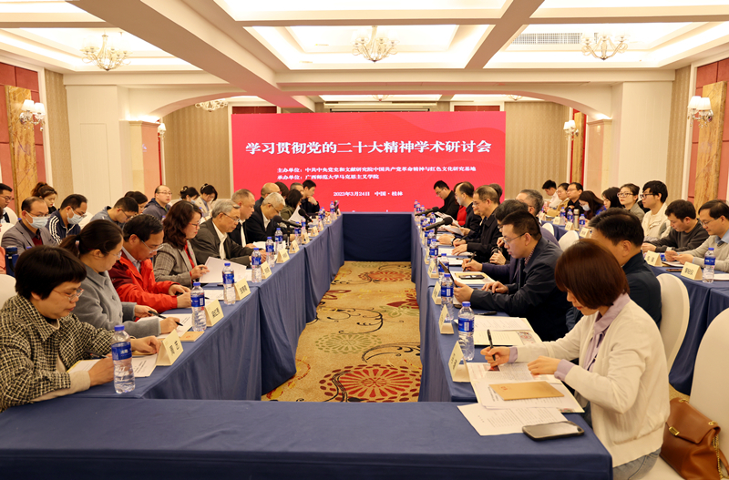 为深入学习贯彻党的二十大精神,深入研究和阐释习近平总书记关于中国共产党革命精神和红色文化的重要论述。3月24日下午,由中共中央党史和文献研究院中国共产党革命精神与红色文化研究基地主办、广西师范大学马克思主义学院承办的“学习贯彻党的二十大精神”学术研讨会在我校举行。中共中央党史文献研究院科研规划部主任张鹏、对外合作交流局局长杨明伟、信息资料馆馆长崔友平、第四研究部副主任许先春、第六研究部副主任卿学民出席研讨会,我校党委副书记赵铁和中共中央党史和文献研究院科研规划部副主任胡长栓致开幕辞。来自中共中央党史和文献研究院和高校党史党建、马克思主义理论专业领域的十余位专家学者作主旨发言,我校马院50多名师生代表参加研讨会。校党委常委、宣传部部长、马克思主义学院院长汤志华,马克思主义学院相关负责人分别主持会议。