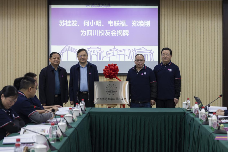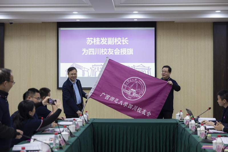 校友办主任宣读了《关于同意成立广西师范大学四川校友会的批复》,校友代表刘玉珺宣读校长、校友会会长贺祖斌为四川校友会成立发来的贺信。与会领导、校友代表共同为四川校友会揭牌,苏桂发为四川校友会授旗、赠送学校文创纪念品并为组织机构成员颁发了聘书。