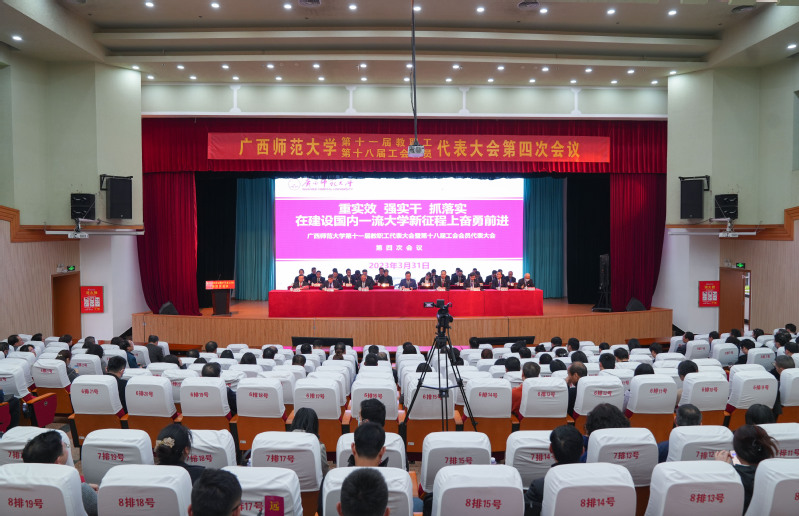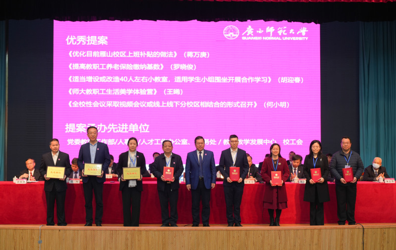 当天,会议还听取了《广西师范大学专业技术岗位结构比例自主设置试点工作实施方案》的说明(书面)、学校2022年预算执行情况说明及2023年经费预算分配方案(书面)、第十八届工会委员会及第十一届教职工代表大会执行委员会2022年工作报告(书面),审议通过了第十一届三次教代会提案工作报告(书面)。