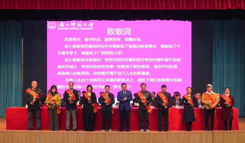 校党委副书记、校长贺祖斌为退休的教职工代表颁发“光荣退休纪念杯”