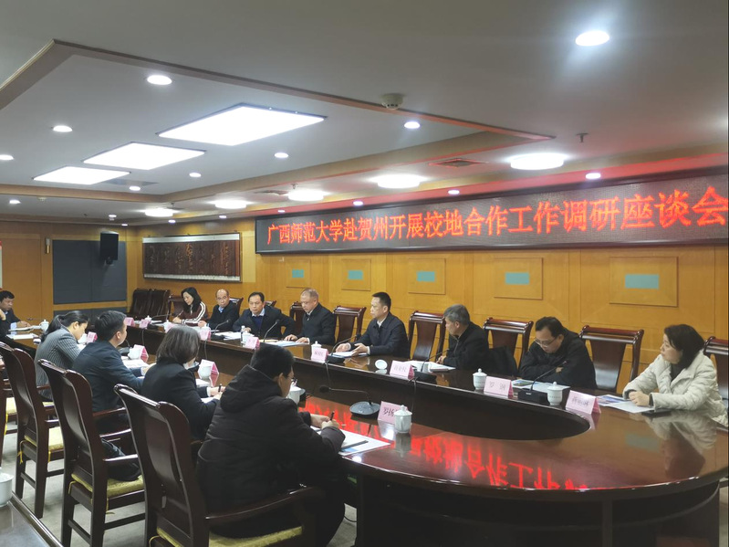 赵铁一行与贺州市委领导开展校地合作座谈。座谈会上,贺州市委常委、组织部部长邓婉玲介绍了贺州市经济发展、人才需求情况和近年来广西师范大学为贺州输送各类优秀人才以及人才发展状况,肯定了师大学子在各条战线上为贺州经济发展作出了积极贡献,同时也希望与我校进一步深化校地合作,探索建立人才引进、就业服务等长效机制,将博士后科研流动站、科研基地等重点实验室拥有的科技人才资源向贺州倾斜,加大对贺州科研项目合作支持力度,与贺州企业加强联合创新,实现双方合作共建、互利共赢。赵铁表达了对贺州市长期以来对学校建设发展大力支持的诚挚谢意,他对建立人才机制、专家科研站等问题做了回应,并表示将持续推进人才工作站建设,进一步深化校地合作,搭建人才精准服务和供需对接平台,为毕业生创造更大的成长和发展空间,构建长期良好互动,实现共赢、共享、共进,全力促进毕业生高质量就业。学校相关部门和学院(部)责任人与贺州市相关部门就座谈的具体工作进行了深入的交流。座谈会后,赵铁带队走访了广西黄金珠宝产业园、贺州市职业教育发展中心、贺州市体育学校、贺州市钟山县工业园区、旺峰实验学校等企业学校以及看望了贺州校友会校友代表。