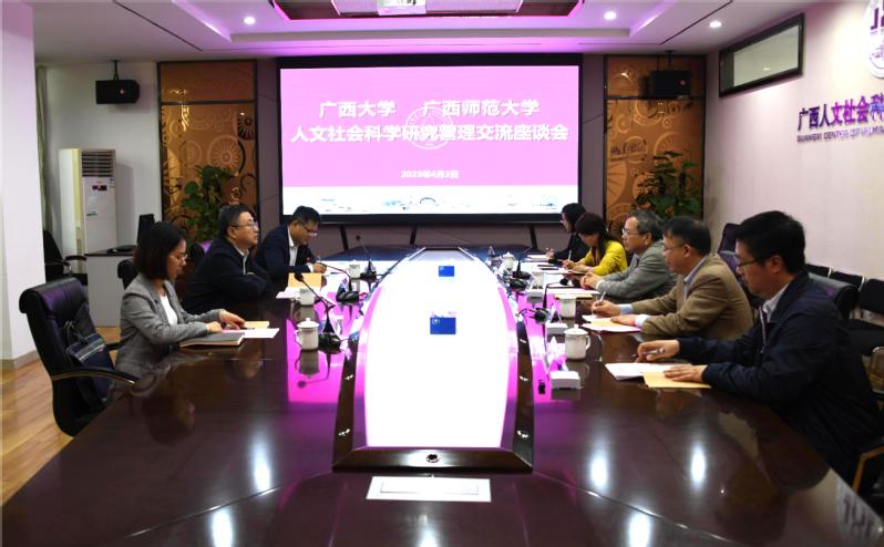 4月3日,广西大学党委常委、副校长田利辉率广西大学科研院社会科学处相关负责人来校,就社科研究评价与激励机制、智库成果评价和应用转化机制、国家社科基金项目组织申报等主题进行座谈交流。我校党委常委、副校长苏桂发出席座谈会,我校社会科学研究处/广西人文社会科学发展研究中心负责人及相关人员参加座谈交流。座谈会由社会科学研究处主要负责人主持。