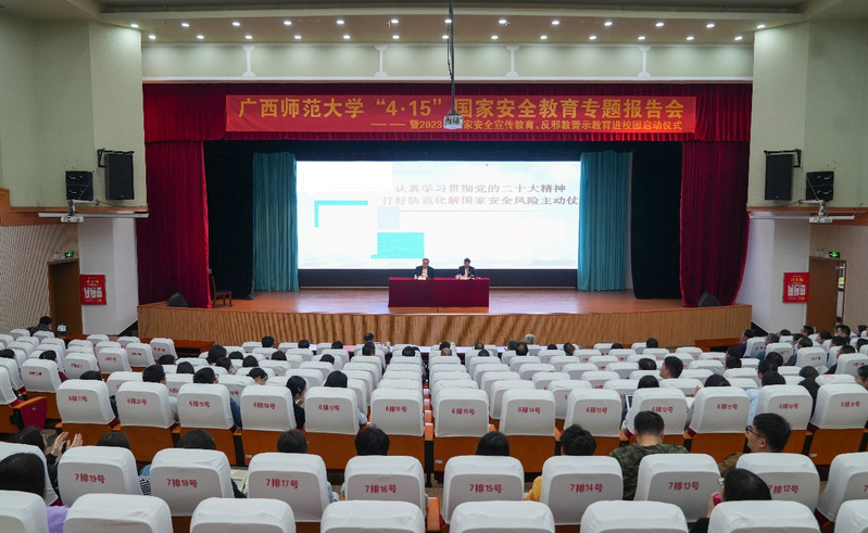 为深入学习贯彻党的二十大精神,贯彻总体国家安全观,着力推动大安全理念深入人心、落地生根,4月14日下午,我校在育才校区田家炳教育书院一楼报告厅举行 “4·15”国家安全教育专题报告会暨2023年广西师范大学国家安全宣传教育、反邪教警示教育进校园启动仪式。校党委常委、副校长黄文韬主持会议。