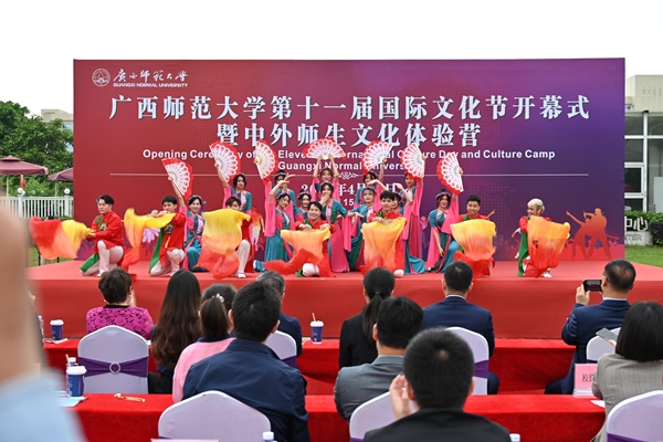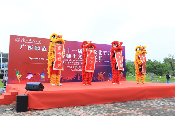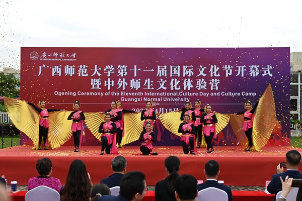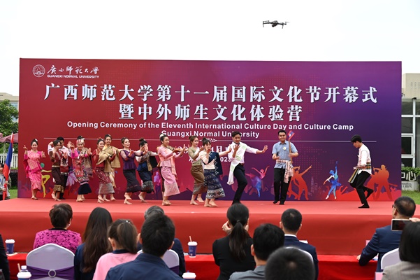 4月15日,第十一届“国际文化节”开幕式暨中外师生文化体验营在雁山校区孔子广场拉开帷幕。校党委常委、副校长苏桂发、泰王国驻南宁总领事馆总领事彬嘉玛·塔维她雅浓(MS.BENJAMAS TANVETYANONT)、领事李梅(MISS. NUCHJAREE WIWATCHAYANGKUN)、越南社会主义共和国驻南宁总领事馆领事武胜利(VU THANG LOI)、加拿大国际教育基金会董事长荣守宇(RONG SAMUEL SHOUYU)、桂林市公安局出入境管理支队代表、桂林兄弟高校代表、学校职能部门和学院代表、各媒体记者、摄影爱好者和两千多名中外师生参加本次活动。