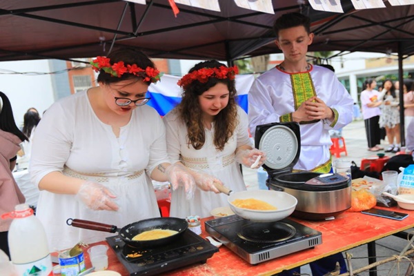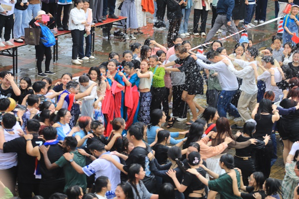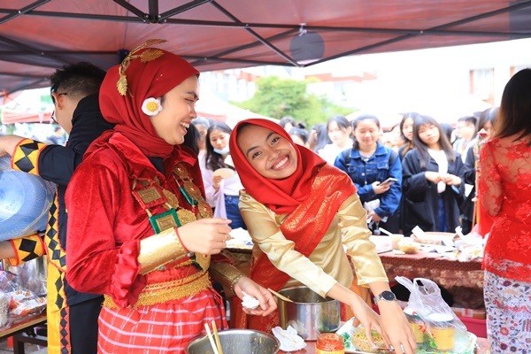 本次国际文化节开幕式分歌舞表演、品尝美食、泼水和游戏等环节。来自中国、越南、泰国、印度尼西亚、老挝、俄罗斯等国的中外学子联袂演出,不仅有极具各国民族特色的歌舞表演,还有中国传统体育项目舞龙舞狮表演,精彩纷呈的表演赢得了在场观众的阵阵掌声。文化节恰逢泰国、老挝、缅甸、柬埔寨等东南亚国家的传统新年,大家通过互相泼水等祝福方式庆祝节日。在场的中外师生纷纷加入泼水狂欢,互相泼洒,追逐嬉戏,传递着新年的美好祝愿与快乐,活动现场成为欢乐的海洋。文化体验营则是另一番热闹的景象,各国学生尽情展示本国的文化风采,还准备了特色的家乡美食和民族游戏。俄罗斯的莓果派、泰国的芒果糯米饭、越南的春卷、老挝的木瓜沙拉、柬埔寨的高棉米粉、巴基斯坦的Biryani香饭、东帝汶的炸香蕉、印度尼西亚的奶酪玉米、中国瑶族的油茶等各国美食香气四溢,大家沉浸在欢乐的节日氛围中。