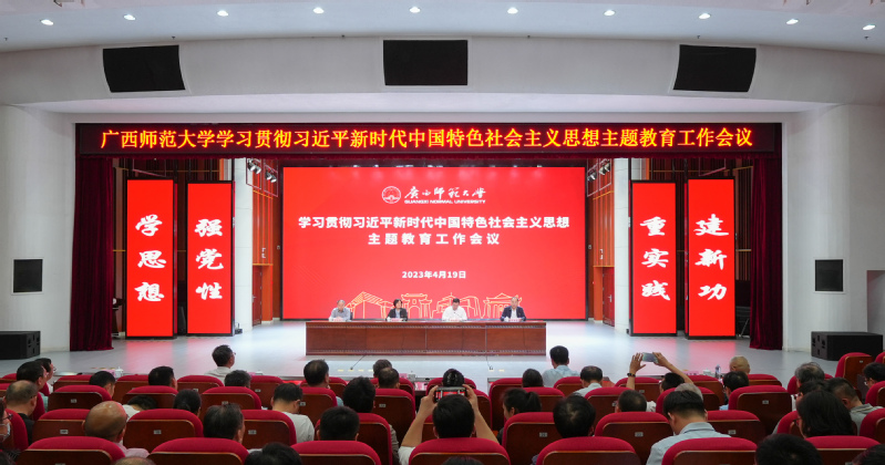 4月19日,学校在雁山校区召开学习贯彻习近平新时代中国特色社会主义思想主题教育工作会议,会议深刻认识主题教育的重大意义、根本任务、目标要求和重点措施,切实把思想和行动统一到习近平总书记重要讲话精神以及党中央和自治区党委的决策部署上来,以高度的政治自觉、饱满的政治热情、严肃的政治态度,扎实开展学习贯彻习近平新时代中国特色社会主义思想主题教育,不折不扣抓好贯彻落实。校党委副书记、校长、学校主题教育领导小组组长贺祖斌出席会议并作部署讲话。自治区第十四巡回指导组组长、桂林电子科技大学党委副书记陈贵英到会指导并讲话。校党委副书记旷永青主持会议,巡回指导组成员、自治区市场监管局二级巡视员苏彩和同志,全体校领导、校党委常委出席会议。