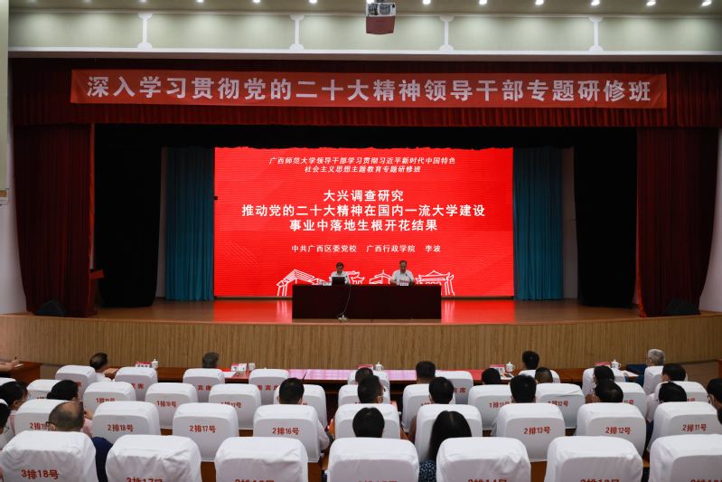 近期,学校党委在扎实推进主题教育读书班,全面系统、及时跟进强化理论学习的基础上,举办学校领导干部学习贯彻党的二十大精神暨主题教育专题研修班。此次报告会是专题研修班系列报告会之一,下一阶段,学校党委将围绕传承红色革命基因、建设新时代壮美广西等主题持续开展专题报告会,引导广大党员干部认真学原著悟原理,在理论与实践中汲取精神力量,提高政治能力,强化使命担当。