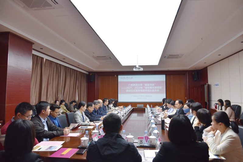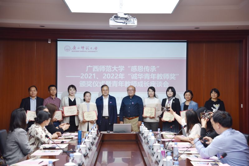 5月8日下午,由校教育发展基金会发起的“感恩有你”系列活动之广西师范大学“感恩传承”——2021、2022年“诚华青年教师奖”颁奖仪式暨青年教师成长座谈会在育才校区国教楼2号楼211会议室举办。校党委常委、副校长苏桂发,“诚华青年教师奖”设立人、我校杰出校友韦诚出席了座谈会。校宣传部、教务处、科技处、社科处、文学院/新闻与传播学院、外国语学院等单位负责人、往届“诚华青年教师奖”获奖教师代表、2021、2022年“诚华青年教师奖”获奖教师及基金会全体人员40余人参加了座谈会。会议由校友工作办公室主任、教育发展基金会管理办公室主任(兼)教育发展基金会理事长何小明主持。