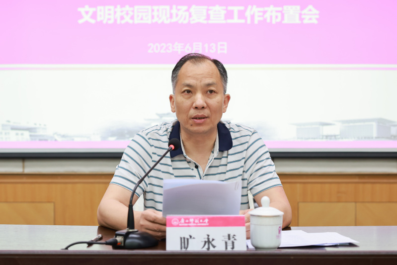 旷永青指出,今年是精神文明创建的集中检阅年,也是我校文明校园的大考之年。就做好本次文明校园现场复查工作,旷永青提出四点要求:一是思想认识要再深化。要以“巩固、提高、延伸”为切入点,高标准、严要求、树形象、提质量,将文明校园创建工作做细、做实、做到位。二是复查重点要再攻坚。要认真梳理、突出重点,要把实地考察指标、薄弱环节、对照指标等方面作为重点。三是聚焦不足要再细化。要始终坚持问题导向,找出不足、细化清单、补齐短板。四是全员创建要再强化。各学院部、各单位要服从安排,积极配合,切实担负职责,准确把握时间节点,高效落实方案,确保顺利完成文明校园现场复查工作。