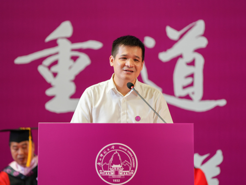 典礼仪式上,教师代表、化学与药学学院/国家重点实验室教师唐海涛从化学出发,分享了他的学术科研历程。他勉励毕业生们要始终保持学习之心,像生物催化剂“酶”一样,高效又专一地催化自己学习;始终保持进取之心,在以后的深造或工作中面对逆境,不要妥协,如乙醇一样,经历时间的考验,日久弥香。