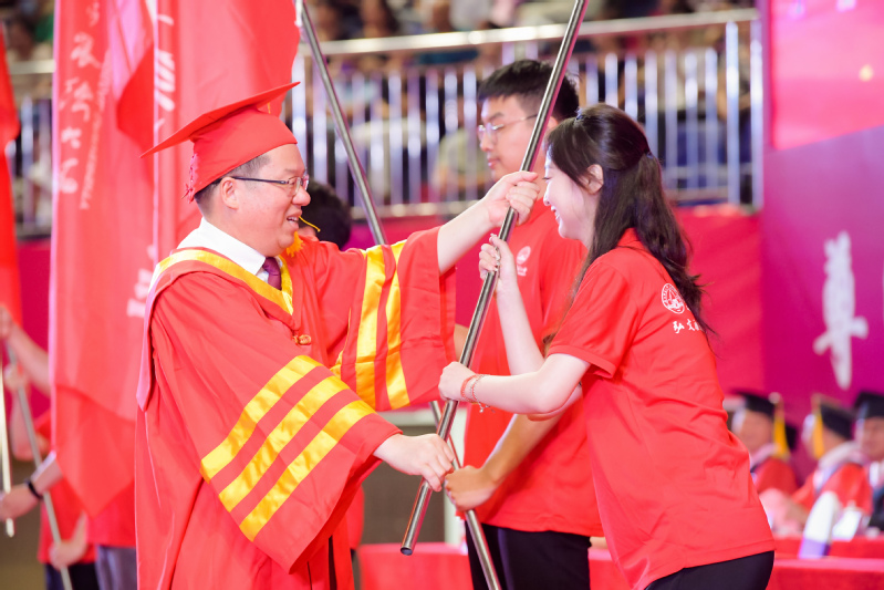 校长贺祖斌为2023届赴基层就业毕业生代表授出征旗