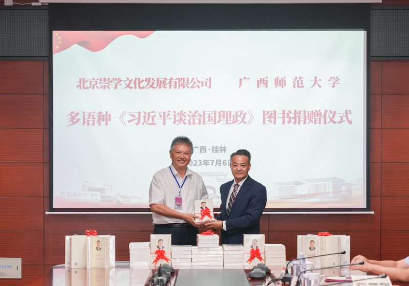 7月6日,我校在雁山校区图书馆第二会议室举行多语种《习近平谈治国理政》图书捐赠仪式。北京崇学文化发展有限公司向我校捐赠多语种《习近平谈治国理政》系列图书,共计8个语种版本,290册。校党委书记贺祖斌出席仪式并向捐赠单位代表余富文颁发捐赠证书,校党委常委、副校长宋树祥主持仪式。