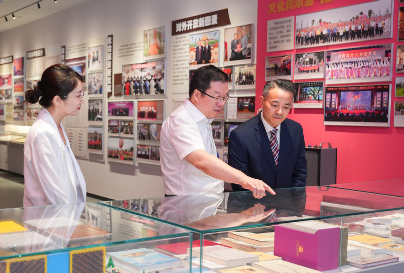捐赠仪式后,校党委书记贺祖斌陪同余富文参观我校校史馆、桂学博物馆、雁栖湖文化景观等。