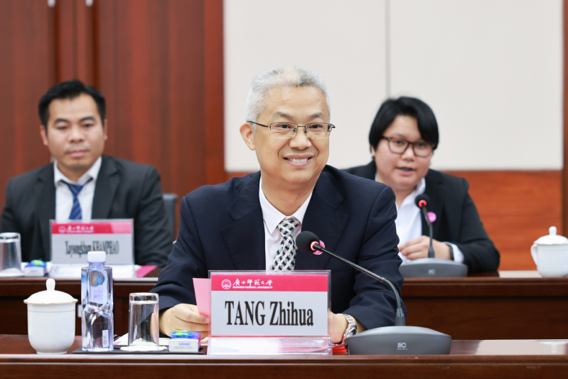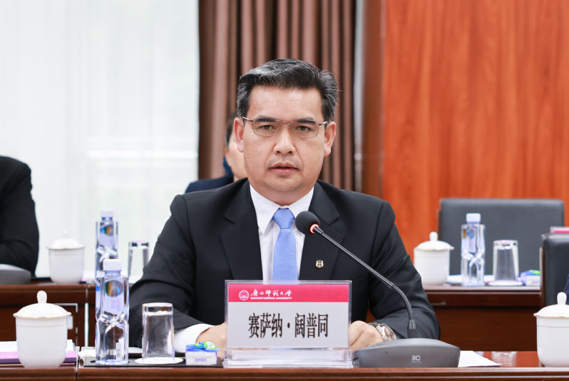 赛萨纳·阔普同检察长首先代表老挝最高人民检察院向广西师范大学表示感谢,他深情回顾了与我校交往的历史,对我校为老挝和老挝最高检培养很多优秀人才给予高度评价。他表示,老挝高度重视“一带一路”倡议,他对老挝最高人民检察院与我校签订的合作协议高度认可。他希望我校能为老挝最高人民检察院开通中英文线上学习博士课程、提供中短期培训并为老挝政法系统人员提供学历教育就读机会的愿望,双方能形成全方位的合作。他对当天参加会议、正在我校攻读博士研究生的老挝检察系统4名工作人员深情寄语,叮嘱他们努力学习,利用所学到的知识回国更好地发展老挝。最后,他祝福中老两国和两国人民之间能巩固发展全方位的命运共同体关系,友谊地久天长。