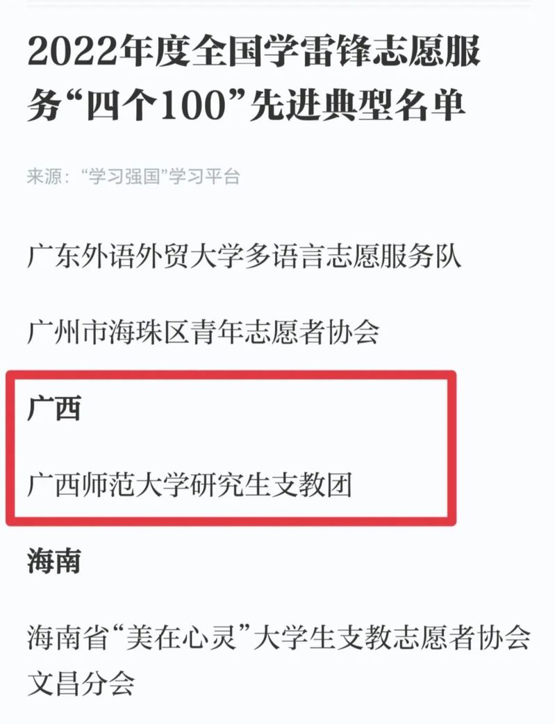 近日,中央宣传部、中央精神文明建设办公室、民政部等18家单位和部门日前联合发出通知,公布2022年度全国学雷锋志愿服务“四个100”先进典型名单。广西师范大学研究生支教团被推选为“最佳志愿服务组织”。是广西区内唯一入选的高校志愿服务组织。