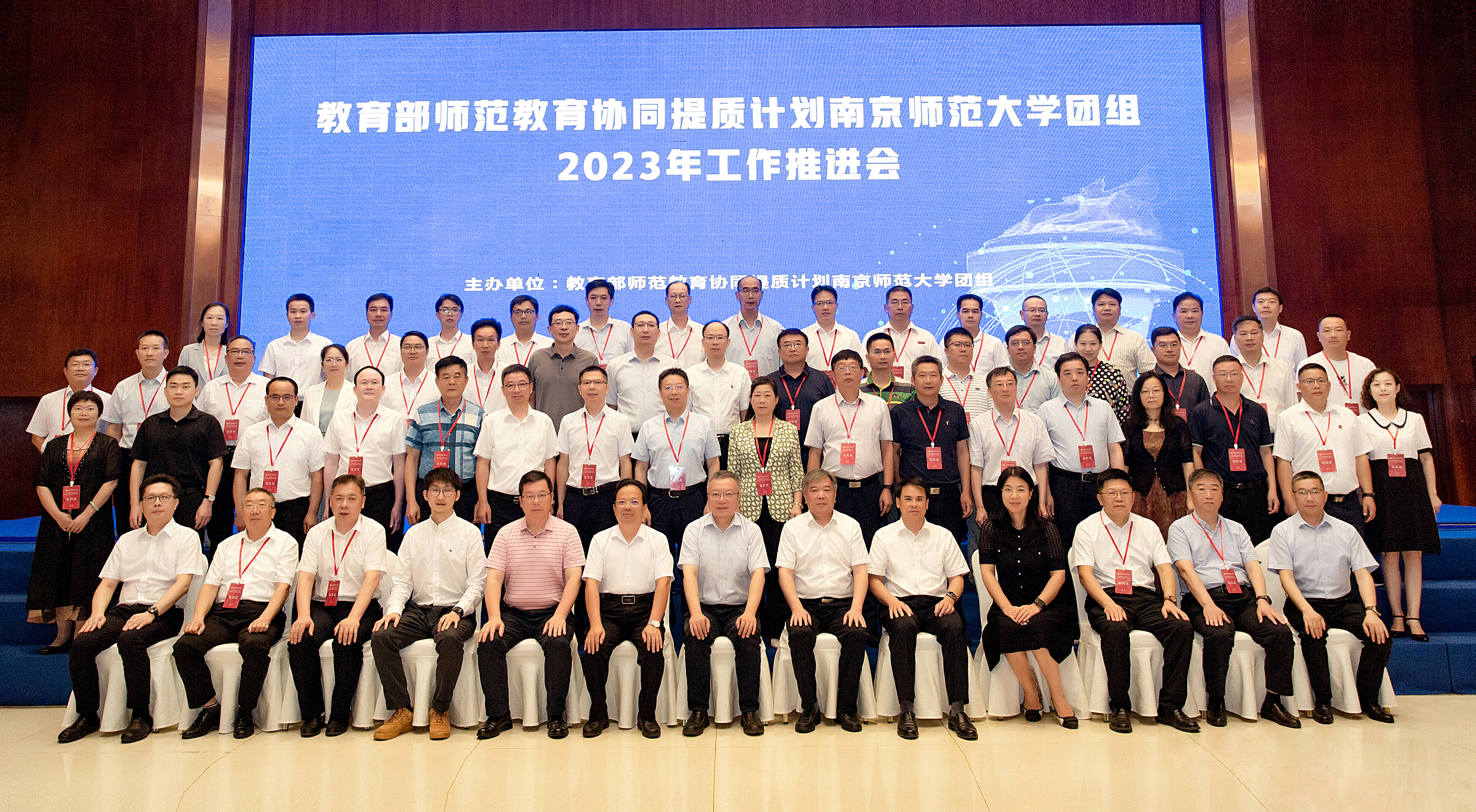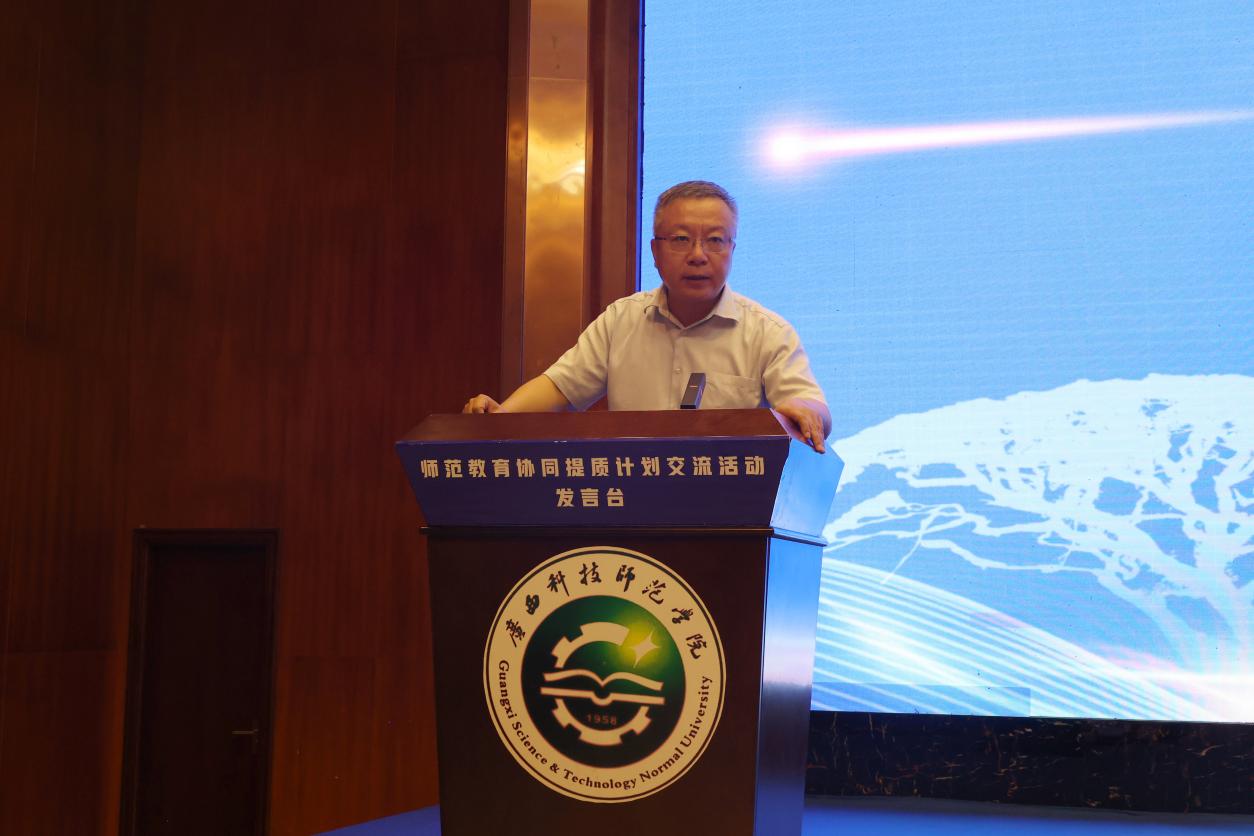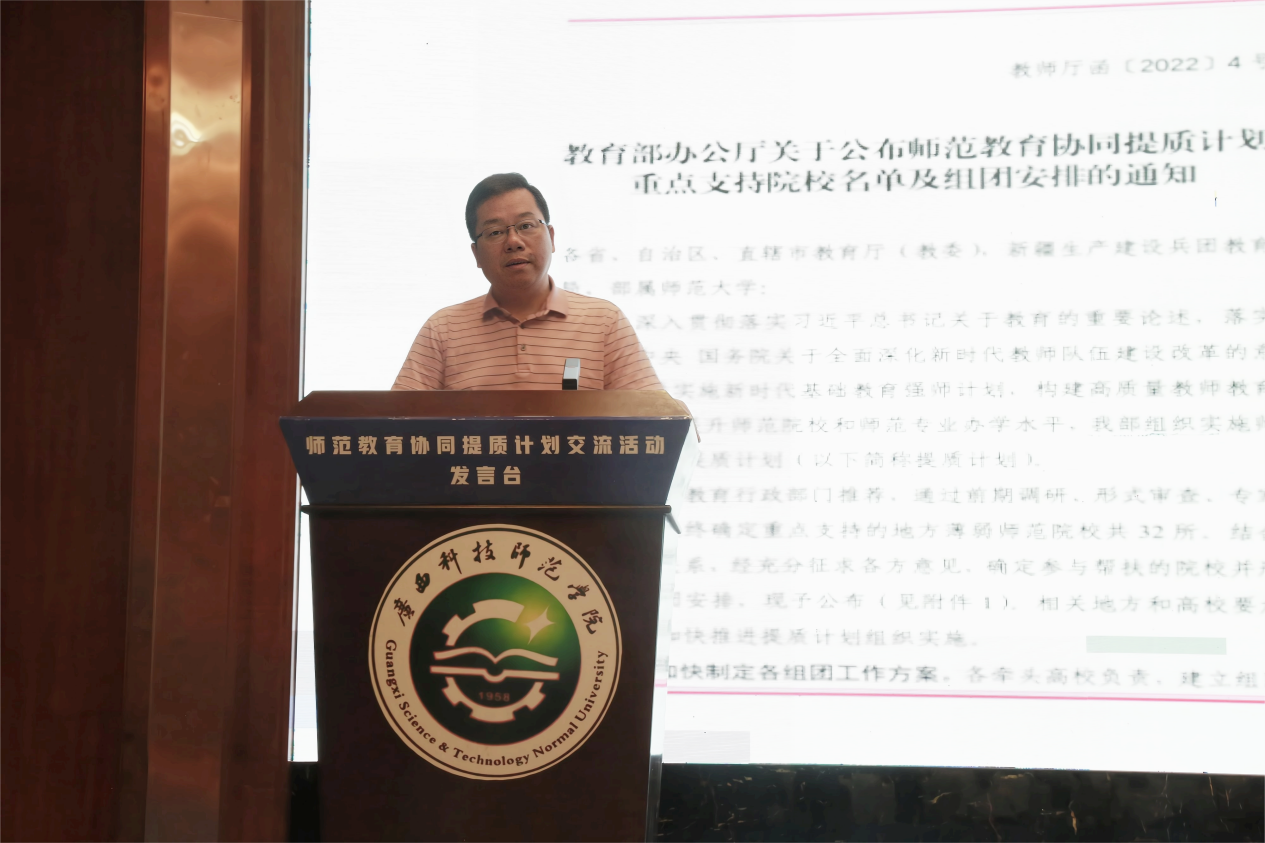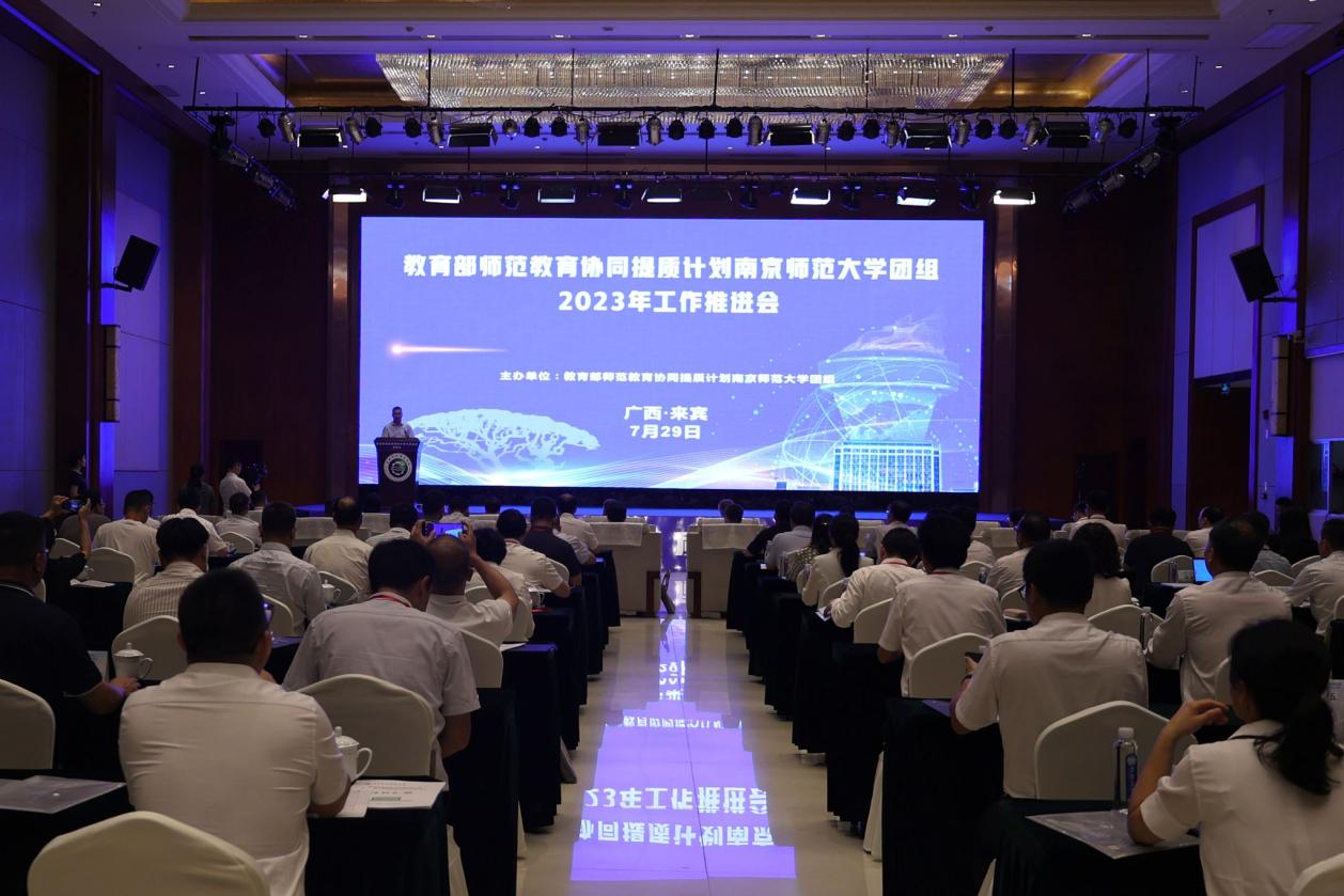 7月29日,教育部师范教育协同提质计划南京师范大学团组2023年工作推进会在广西科技师范学院举行,教育部教师工作司司长任友群出席并讲话,广西壮族自治区教育厅副厅长伍锦昌、来宾市副市长邓应文以及团组七所高校校领导出席会议。我校党委书记贺祖斌率领发展规划处、教务处相关负责人参加会议并作主题发言。会议由广西科技师范学院校长杨杰主持。