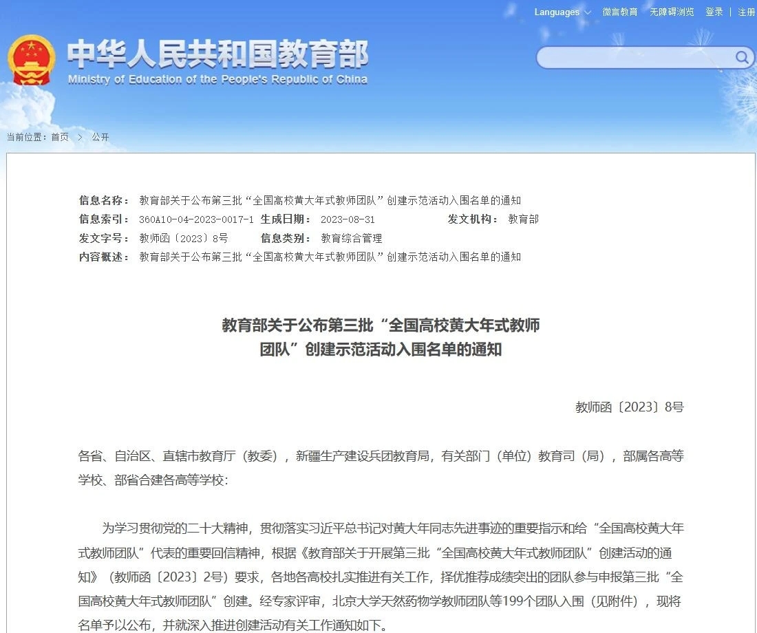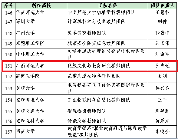 近日,教育部公布第三批“全国高校黄大年式教师团队”创建示范活动入围名单,我校校长、教育学部孙杰远教授领衔的“民族文化与教育研究教师团队”入选,是广西高校入围的2个团队之一。