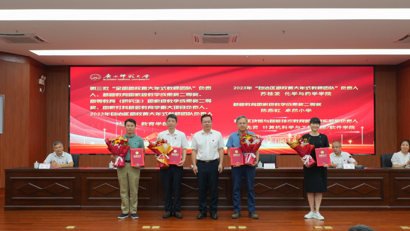 校党委副书记、校长孙杰远为荣获第六届全国高校青年教师教学竞赛文科组二等奖、第六届全国高校青年教师教学竞赛理科组三等奖、全国第三届教师教学创新大赛三等奖、2022年广西社会科学优秀成果奖一等奖、2022年广西自然科学奖一等奖以及2022年广西科学技术进步奖二等奖的教师颁奖