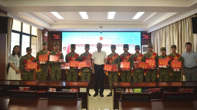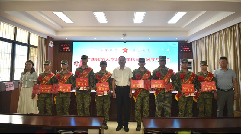 9月12日,我校在桂林市秀峰区武装部为2023年秋季从学校光荣应征入伍的20名大学生举行了入伍欢送会。校党委副书记旷永青、学生工作部(处)主要负责人、武装部主要负责人、入伍学生所在学院辅导员和秀峰区武装部有关同志出席欢送会,会议由我校武装部主要负责人主持。