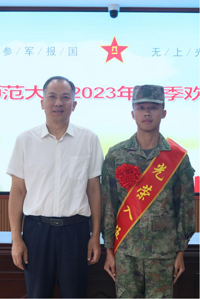 (校党委副书记旷永青与二次入伍学生体育与健康管理学院黄延海合影)