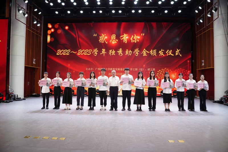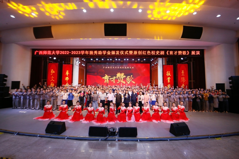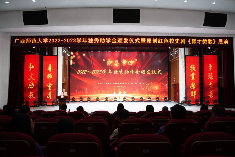 为庆祝学校91周年华诞,充分展示学校91年发展的光辉历程,展现全体师生良好的精神风貌,并弘扬慈善大爱精神,引导和动员全校师生践行慈善理念,进一步推进校园“慈善公益、感恩乐捐”文化建设,10月12日晚上,我校2022~2023学年独秀助学金颁发仪式暨原创红色校史剧《育才赞歌》展演活动在雁山校区音乐学院三楼多功能厅举行。校党委副书记赵铁,校党委常委、副校长黄晓昀出席活动。学校各学院(部)、各单位负责人,新入职教职工代表,独秀助学金获得者代表,新生代表现场参会。