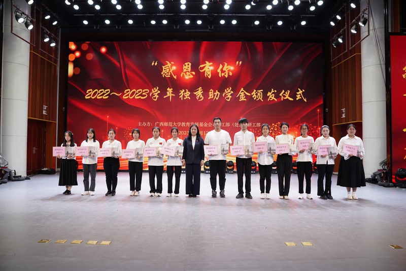 校友工作办公室/教育发展基金会管理办公室主任、校教育发展基金会理事长在颁发仪式上宣读2022~2023学年独秀助学金获得者名单。颁发仪式上,播放了2022~2023学年独秀助学金获得者感言视频,表达了学子们对学校的感恩之情以及立志在未来的人生道路上迎难而上,追逐梦想,做一个志存高远,拼搏奋斗的新时代优秀青年。校党委副书记赵铁,校党委常委、副校长黄晓昀为“独秀助学金”获得者代表颁发独秀助学金。