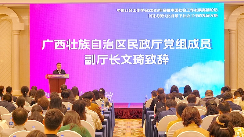 中国社会工作学会会长、北京大学王思斌教授提出应及时总结中国社会工作已取得的经验和存在的不足,开启建设与中国式现代化新阶段相适应的中国社会工作建设之路。中国社会工作教育协会副会长兼秘书长、北京大学马凤芝教授指出,要立足新发展阶段思考赋予中国社会工作的时代任务,在新时代新征程中提高社会工作对社会发展的贡献度,助力国家治理体系和治理能力现代化。广西壮族自治区民政厅党组成员文琦副厅长在致辞中提到近年来广西各地充分发挥乡镇(街道)社工站的平台载体作用,打造了乡镇(街道)社工站、社区志愿服务站、社区慈善服务站三个平台,形成“五社三站”融合发展机制,有效提升基层民生服务能力和社会治理水平。