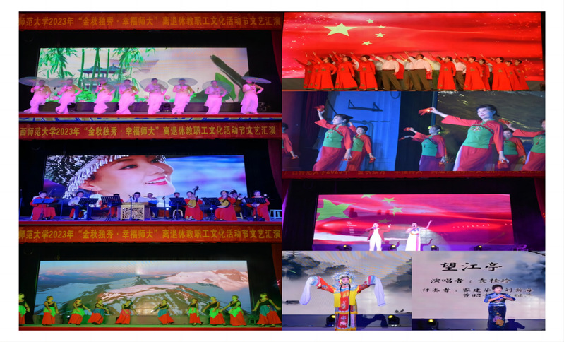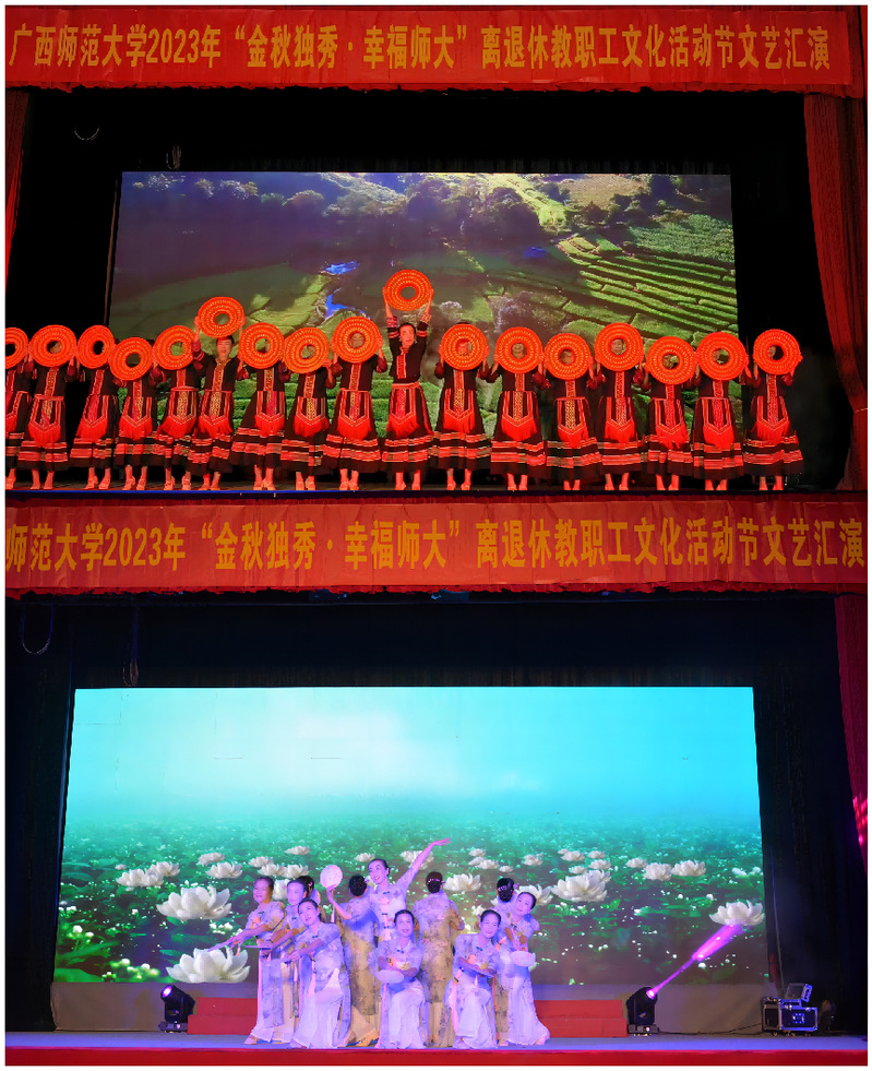 文艺汇演在乐器合奏《美丽的壮锦》中拉开序幕,整台汇演共12个节目,演员们身着盛装闪亮登台,他们用靓丽的舞姿、优美的歌声,无比热情地唱响对新时代的赞扬。古典舞《茉莉花》和《瑶.花帽》由我校音乐学院原院长黄小明教授编导,广西师范大学离退休乐年艺术团舞蹈队表演,更是把现场的气氛推向了高潮,《瑶.花帽》于近日参选2024年广西离退休干部新春特别节目文艺作品征集;大合唱《这世界有那么多人》、时装走秀《年轻的脚步》和群舞《我和我的祖国》由乐年学院声乐班、乐年学院形体气质班和乐年学院舞蹈基础班学员表演,大合唱演唱者中最高年龄达83岁;群舞《雨打芭蕉》、藏族舞《格桑拉》、男女二重唱《我爱你中国》、群舞《彝家山寨欢乐多》、表演唱《我们共产党人好比种子》、京剧唱段《望江亭》、《状元媒》,演员们一颦一笑尽显端庄大气,展示着师大人的幸福与豪迈,彰显了她们永远年轻的心态,抒发了对党和国家的美好祝福。