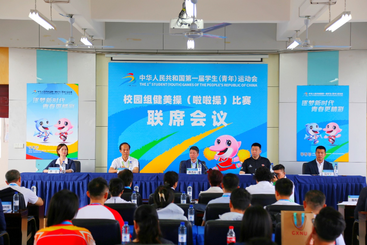 11月4日,全国第一届学生(青年)运动会校园组(大学)健美操(啦啦操)项目联席会议在我校雁山校区体育楼503会议室召开。我校党委副书记、校长、本次赛会竞赛委员会主任孙杰远,教育部学生体协联合秘书处副秘书长、中国大学生体育协会副主席、本次赛会竞赛委员会执行主任申震,中国大学生体育协会竞赛部副主任范星宇,中国大学生体育协会健美操与艺术体操分会常务副秘书长、健美操项目仲裁主任、啦啦操项目赛事监督黄育出席会议,体育学院党委负责人、赛事工作人员和各代表队领队教练参加会议。会议由赛事竞赛长杜康华主持。