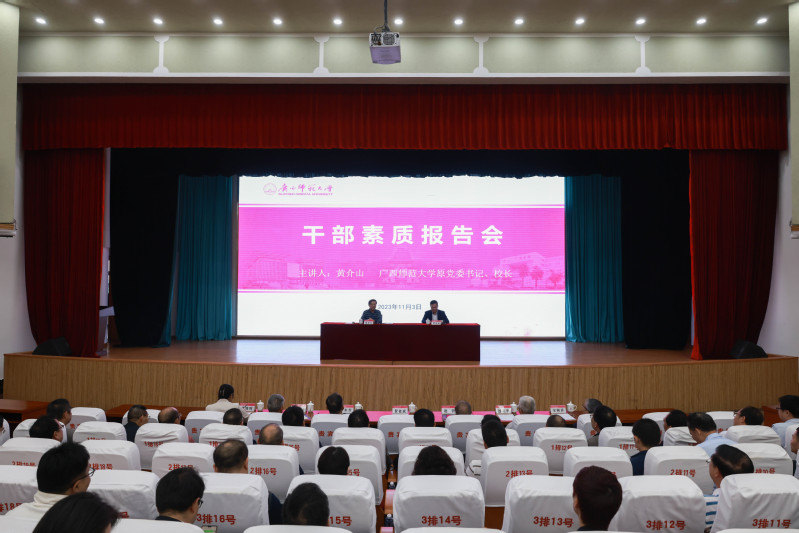 为深入学习贯彻党的二十大精神,全面巩固深化学习贯彻习近平新时代中国特色社会主义思想主题教育成果,进一步增强领导干部政治判断力、政治领悟力、政治执行力。我校于11月3日在育才校区举行学校领导干部素质报告会,广西师范大学原党委书记、校长黄介山受邀作报告。校党委书记贺祖斌主持报告会。