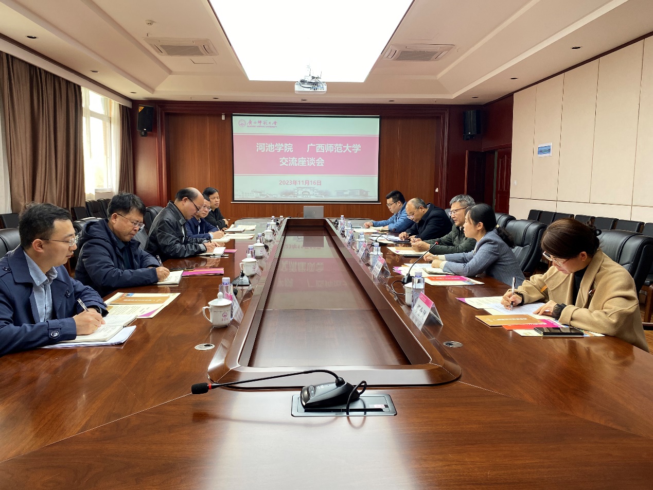 11月16日下午,河池学院贺卫国副校长带领学校相关职能部门负责人一行来我校调研交流。座谈会在育才校区国教楼2号楼211会议室举行,校党委常委、副校长宋树祥,研究生院、科技处、社科处负责人参加座谈。会议由科技处主要负责人主持。