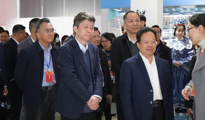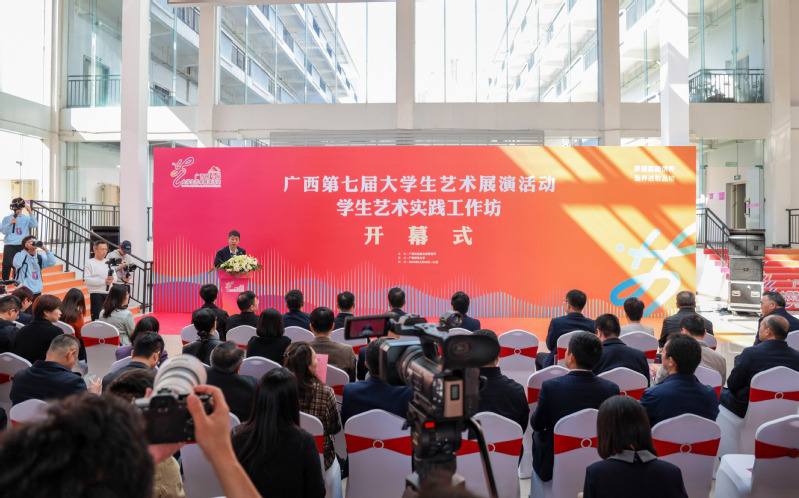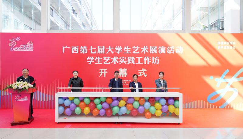 自治区教育厅副厅长伍锦昌,广西师范大学党委副书记、校长孙杰远,自治区教育厅体卫艺处处长万锋锋以及参展师生代表共同为学生艺术实践工作坊揭幕