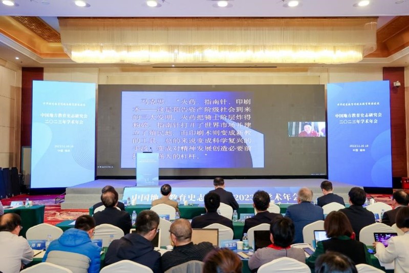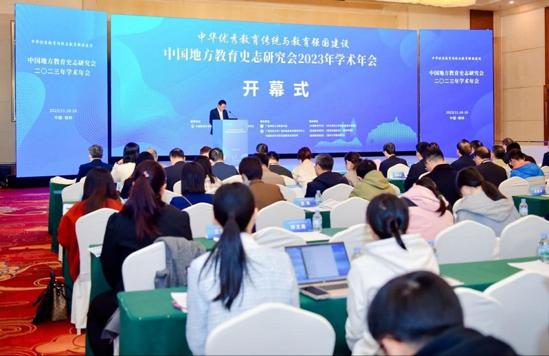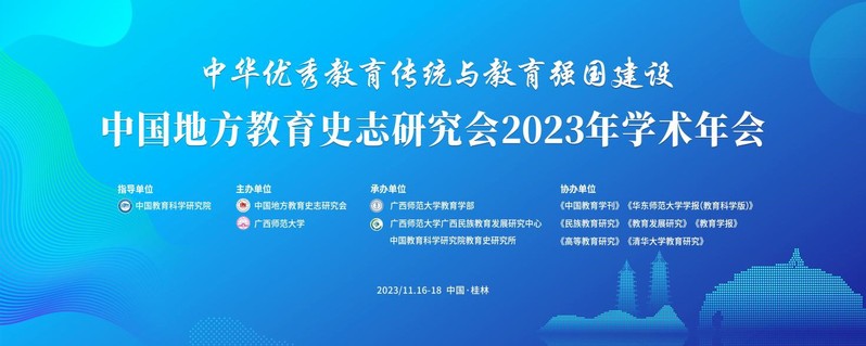 2023年11月16日至18日,中国地方教育史志研究会2023年学术年会在桂林市举办,年会的主题为“中华优秀教育传统与教育强国建设”。本次年会由中国教育科学研究院作为指导单位,中国地方教育史志研究会、广西师范大学主办,广西师范大学教育学部、广西民族教育发展研究中心、中国教育科学研究院教育史研究所承办,《中国教育学刊》、《华东师范大学学报(教育科学版)》、《民族教育研究》、《教育发展研究》、《教育学报》、《高等教育研究》、《清华大学教育研究》共同协办。中国地方教育史志研究会理事、会员,全国教育领域专家学者、青年研究者、硕博士生共计200余人参与本次年会。本次年会中举行了“文化与共生教育研究分会”成立仪式,《共生教育研究》于本次年会创刊。与会代表们通过主旨报告、分组讨论、理事会议、工作报告等形式就中国地方教育史志研究中的热点与难点问题展开深入的研讨与交流。