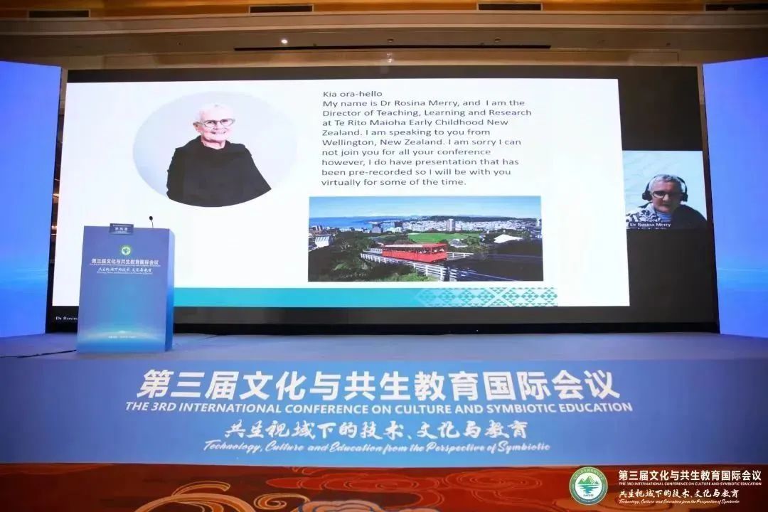 新西兰幼儿教育师范学院副校长Rosina Merry致辞,她指出,系统生命观包含了“共生视域下的技术、文化与教育”这一重要哲学主题,如同生物实体一样,人类社会机构特别是教育、工业和治理,处在复杂且多样的系统之中,是全球系统和和互联网体系的重要组成部分。