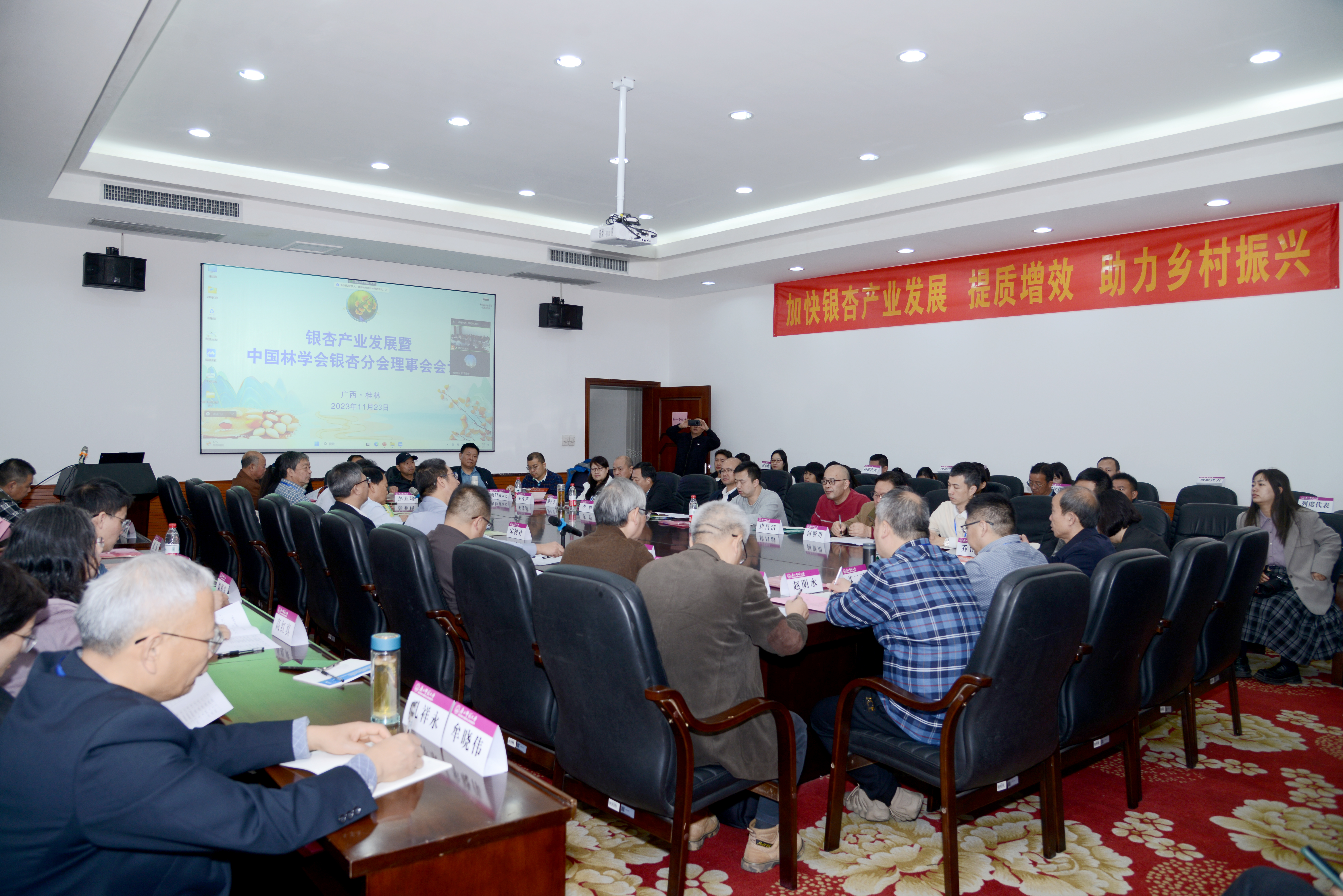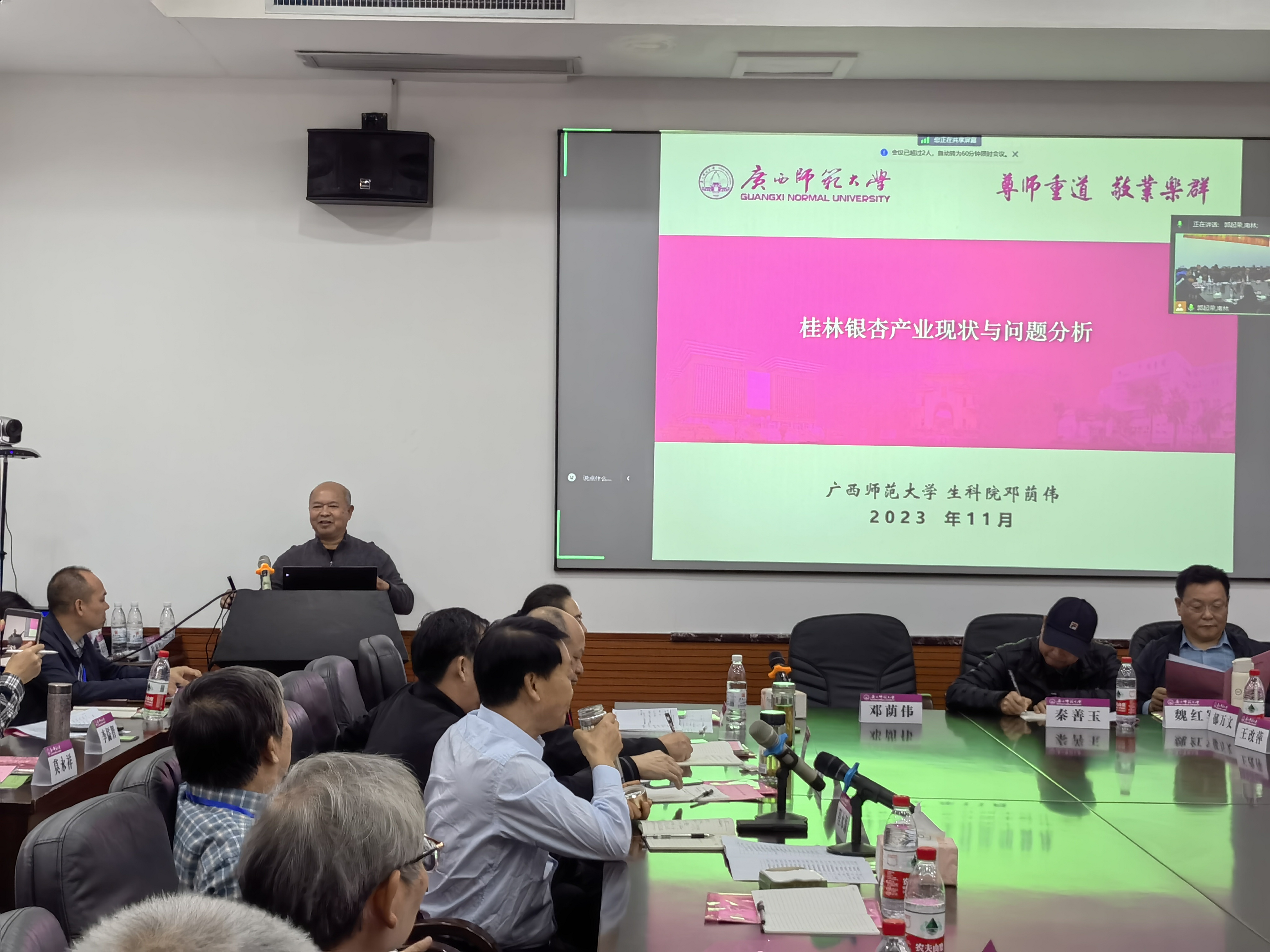 11月23-24日,由中国林学会银杏分会主办,我校生命科学学院“珍稀濒危动植物生态与环境保护教育部重点实验室”、“广西漓江流域景观资源保育与可持续利用重点实验室”承办,桂林市林业科学研究所、灵川海洋乡政府、兴安银杏源酒业有限公司协办的“银杏产业发展暨中国林学会银杏分会理事会”在我校召开。会议主题是加快银杏产业发展,提质增效,助力乡村振兴。来自江苏、山东、浙江、北京、湖北、湖南、陕西、广西等省(市、区)高等院校、科研院所、企业的领导和专家学者与列席代表70多人参加本次会议,共商银杏发展大计。