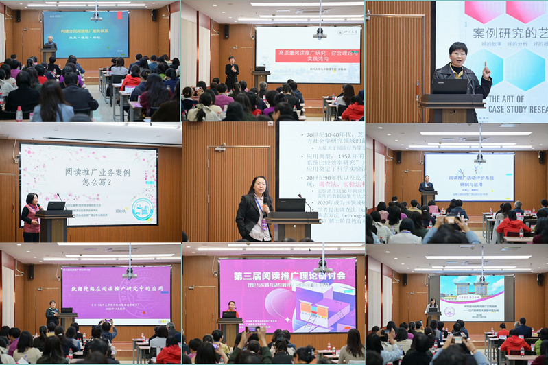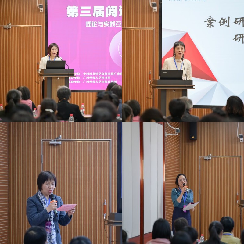 在大会报告及专题发言环节,华东师范大学范并思教授作了“构建全民阅读推广服务体系:政策•理论•路径”、四川大学李桂华教授作了“高质量阅读推广研究:弥合理论与实践鸿沟”、安徽大学严贝妮教授作了“案例研究法在阅读推广研究中的应用”、国家图书馆出版社邓咏秋主任作了“阅读推广业务案例的写作”、浙江大学王素芳副教授作了“实验法在阅读和图书馆阅读推广效果评价研究中的应用”、中原工学院图书馆馆长岳修志作了“阅读推广活动评价系统研制与运用”、南开大学肖雪副教授作了“数据挖掘在阅读推广研究中的应用”、广西师范大学吴云珊研究馆员作了“研究驱动的阅读推广实践创新——以广西师范大学图书馆为例”、上海图书馆许桂菊编审作了《图书馆杂志》常设栏目“全民阅读推广学坛”的报告发言。