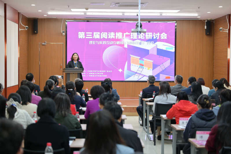 11月25日,由中国图书馆学会阅读推广委员会主办、广西师范大学图书馆承办、广西师范大学出版社集团提供支持的第三届阅读推广理论研讨会“理论与实践互动互融视角下的阅读推广研究”在我校召开。广西师范大学党委常委、副校长宋树祥,中国图书馆协会阅读推广委员会副主任赵俊玲出席会议并致辞。本次会议分开幕式、主旨报告、专家报告、主题发言与互动交流五个环节,中国图书馆学会阅读推广委员会阅读推广专业组的委员、区内外高校及地市的专家学者和图书馆同仁等90多人参加会议。开幕式由广西师范大学图书馆党总支负责人主持。